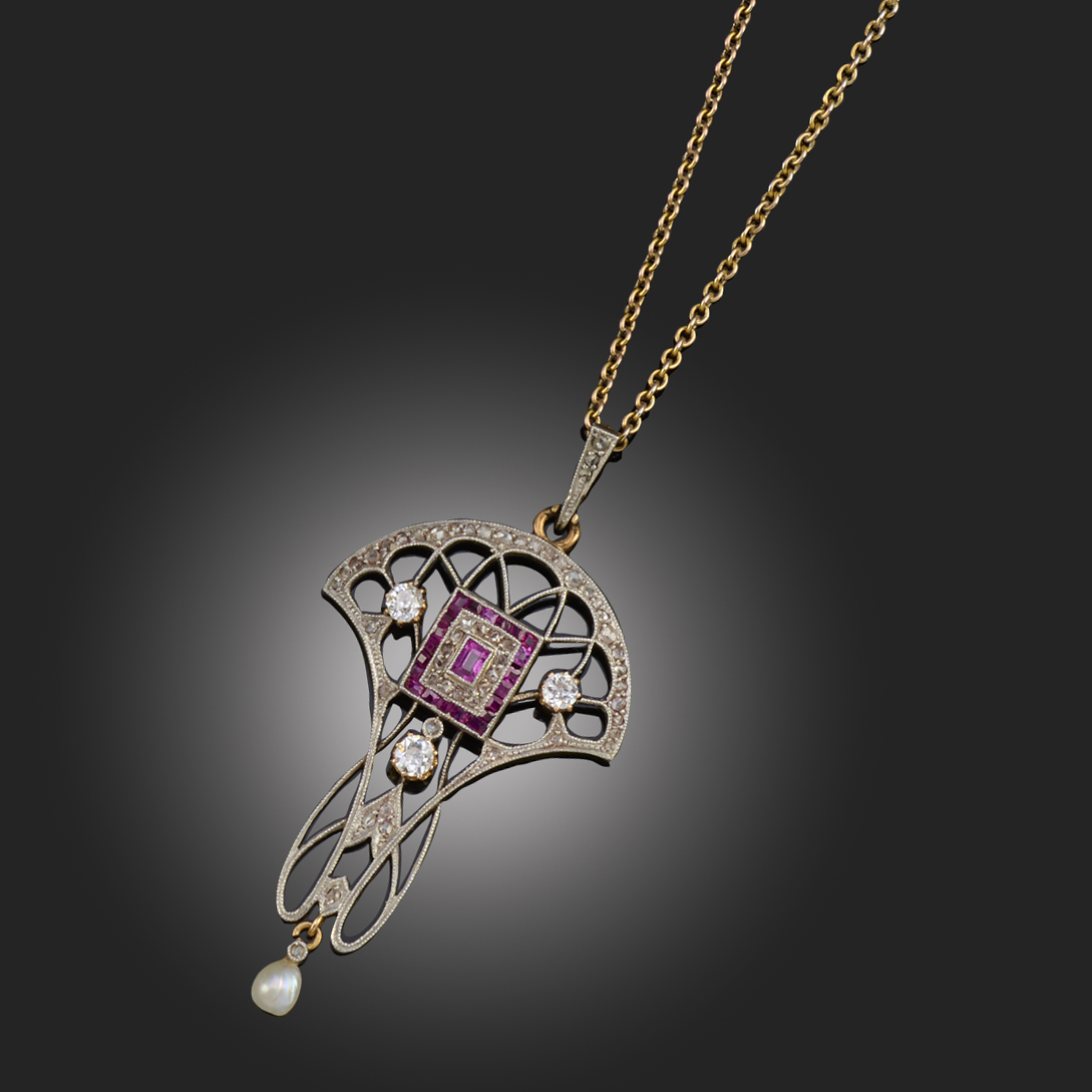 AN ART NOUVEAU RUBY AND DIAMOND PENDANT