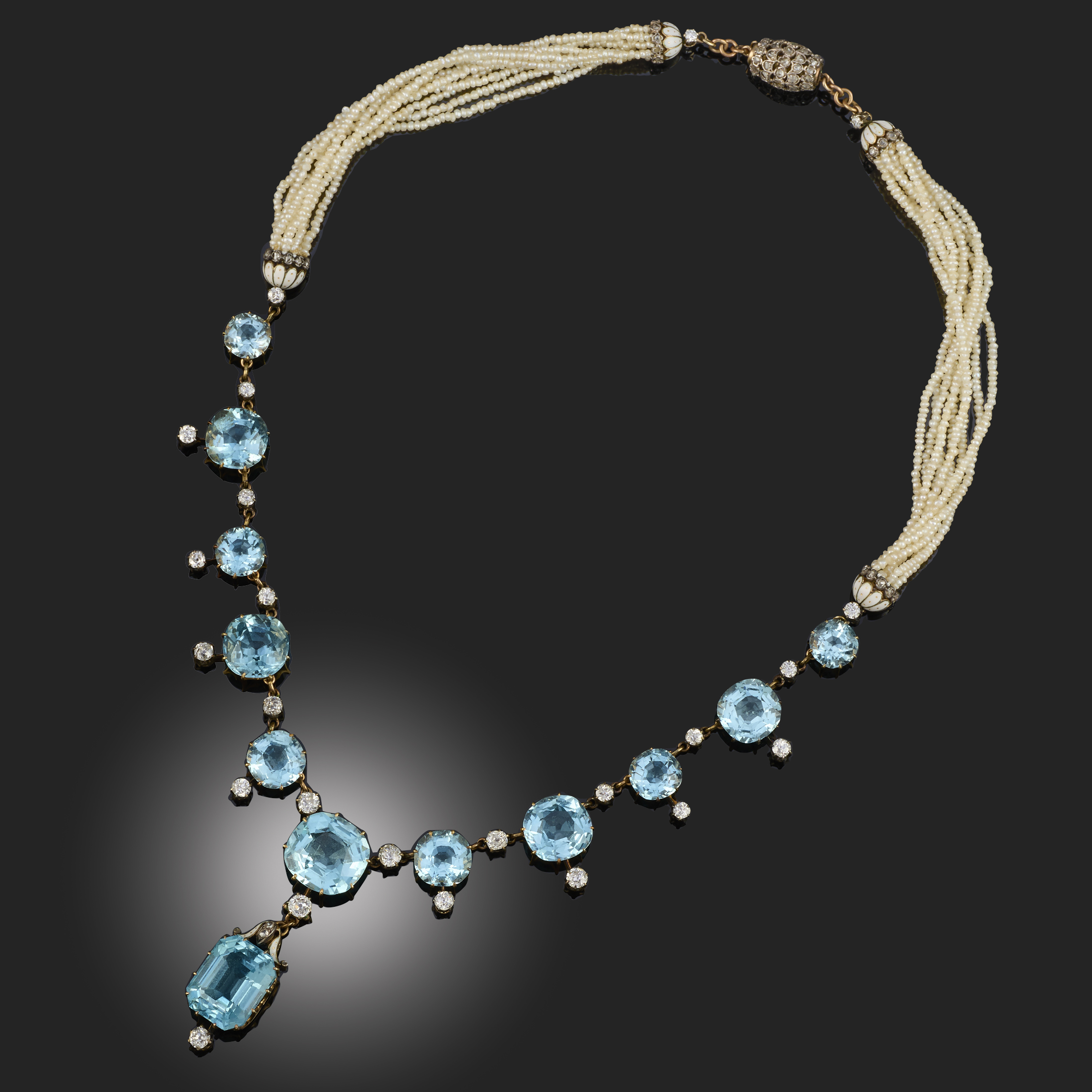 AN AQUAMARINE, DIAMOND, ENAMEL AND SEED PEARL NECKLACE, C1900, with graduating cushion-shaped aquamarines suspending diamonds and separated with diamonds, the central aquamarine suspending a detachable pendant set with an emerald-cut aquamarine and a diamond with enamel decoration, on a seed pearl back chain with enamel and diamond set caps and a clasp set with rose-cut diamonds, length 43cm, cased