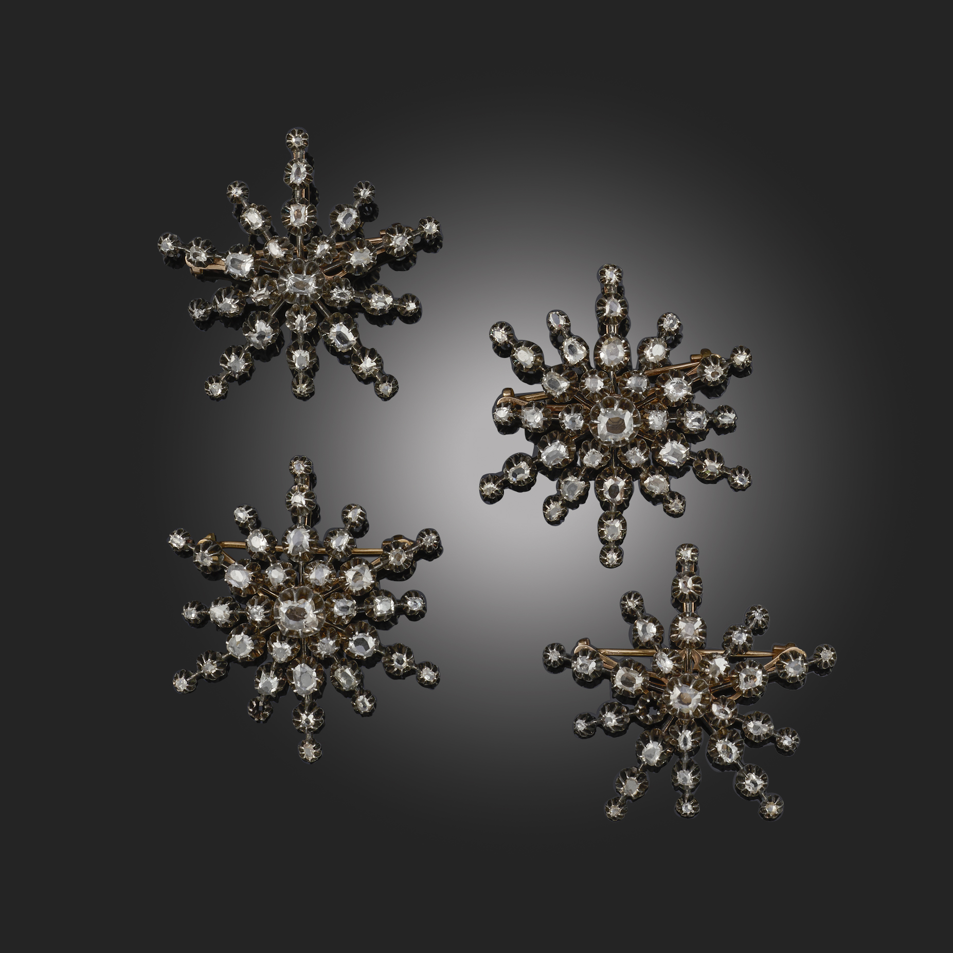 A SET OF FOUR LATE 19TH CENTURY STAR BROOCHES, of radiating design set with graduated rose-cut diamonds in silver and gold, with pendant fittings and detachable brooch fittings, length of each 5cm