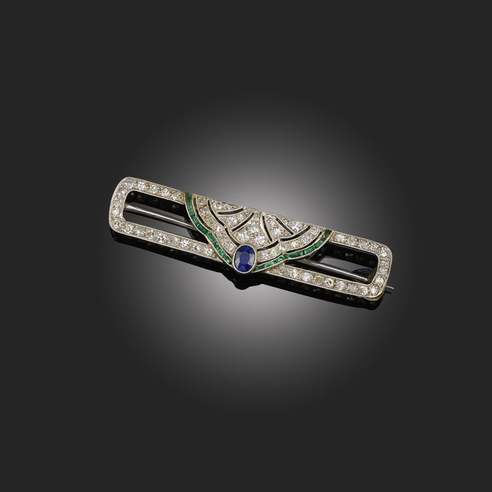 AN ART DECO SAPPHIRE EMERALD AND DIAMOND BROOCH