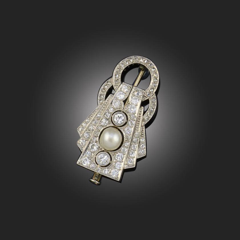 AN ART DECO PEARL AND DIAMOND BROOCH