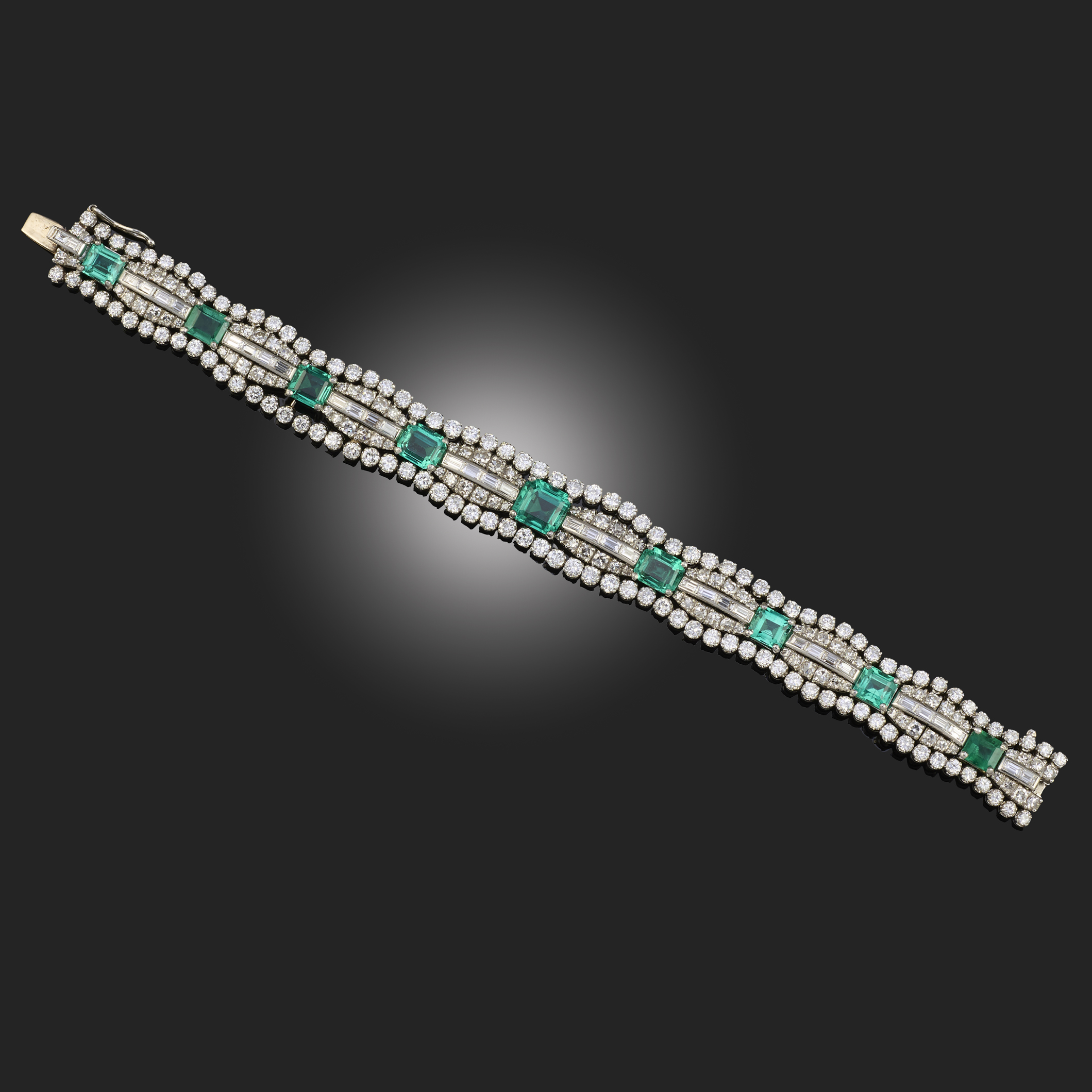 AN EMERALD AND DIAMOND BRACELET, set with graduated step-cut emeralds between lozenge-shaped links set with baguette-shaped and circular-cut diamonds within an undulating diamond border in white gold, total approximate diamond weight 5.50cts, length 17.9cm