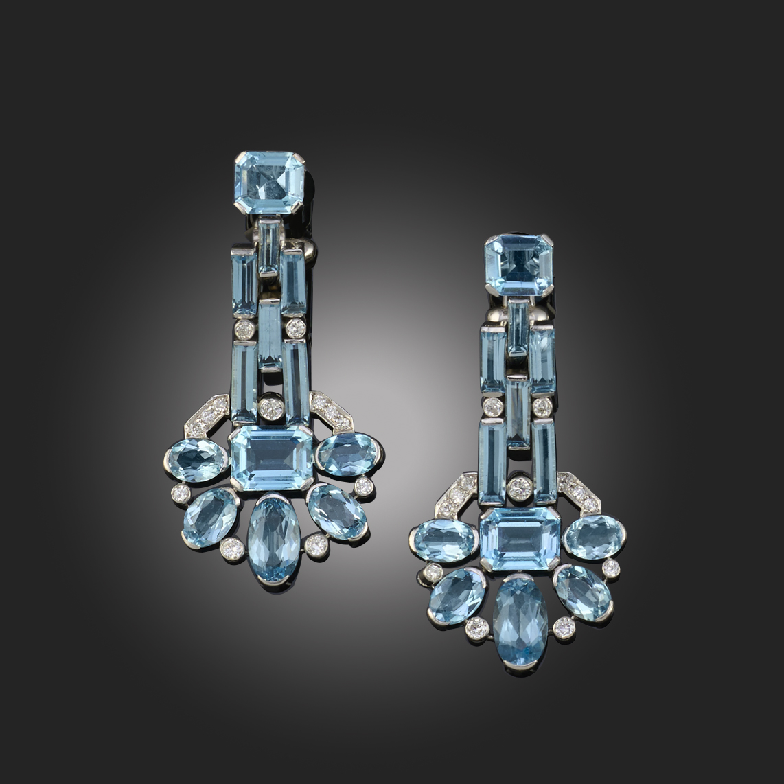 A PAIR OF ART DECO AQUAMARINE AND DIAMOND DROP EARRINGS, 1930's