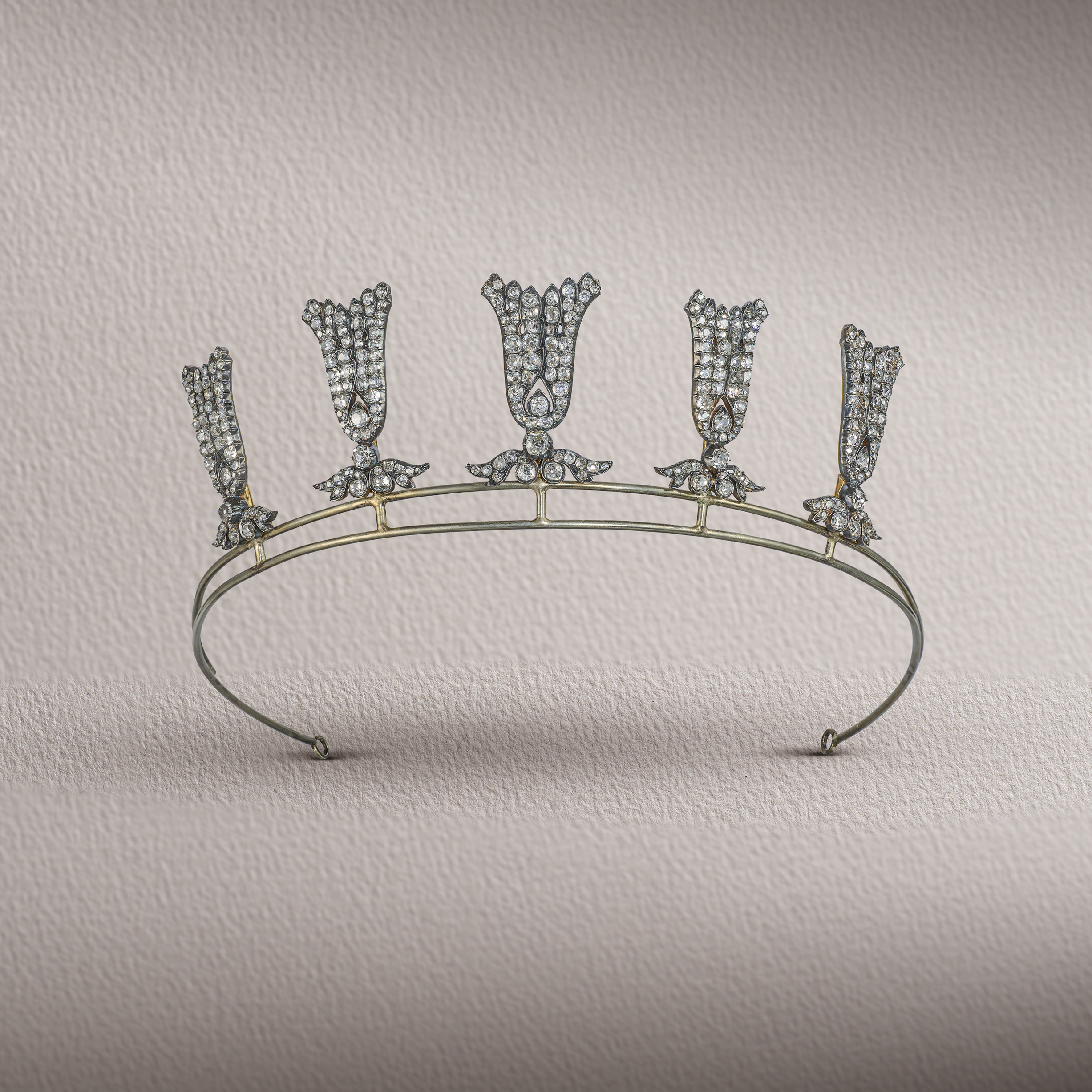 A DIAMOND-SET TIARA, LATE 19TH CENTURY AND LATER, the five graduated stylised tulip motifs set with old cushion-shaped and rose-cut diamonds in silver and gold, to a later base metal frame, total approximate diamond weight 7.50cts, height from the bottom of the frame to the top of the central motif 4.8cm, inner curve of frame approximately 40cm