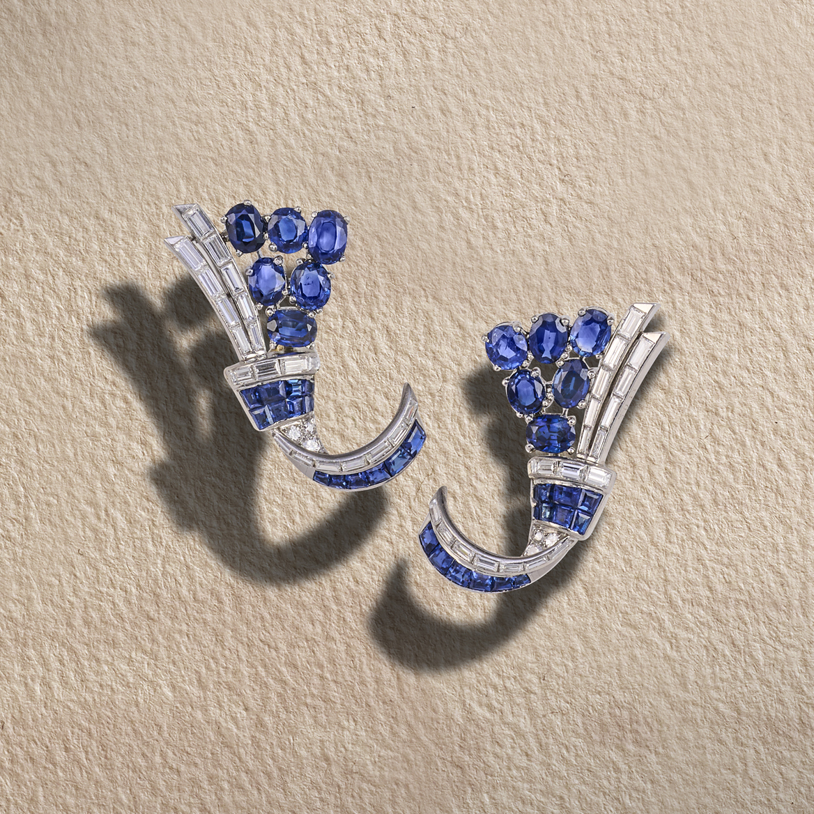 LUCIEN GIRARD FOR LACLOCHE FRÈRES, A PAIR OF SAPPHIRE AND DIAMOND EAR CLIPS, C1935, of stylised cornucopia design set with lines of graduated baguette-shaped diamonds and graduated oval-shaped sapphires in a spray design, waisted with a panel of calibré-cut sapphires and further diamonds in platinum and white gold, additional hinged clip fittings allowing the earrings to be worn as a pair of lapel brooches, signed, with maker's mark and French control marks, length 4.4cm