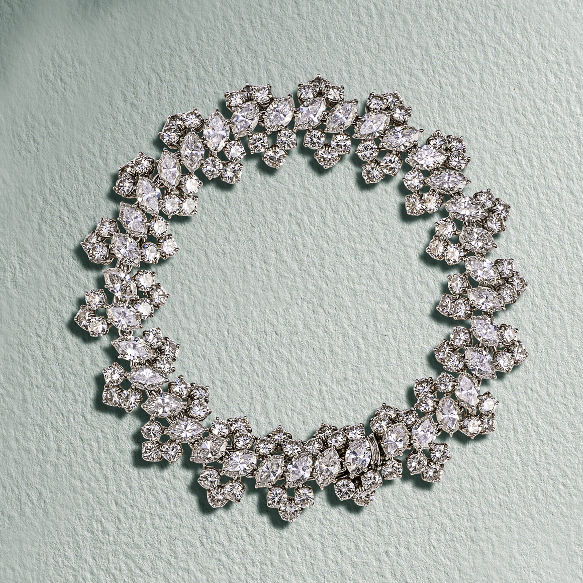 A DIAMOND BRACELET, set with a row of marquise-shaped diamonds, within clusters of three round brilliant-cut diamonds in platinum, marked OR and numbered 7031, indistinct marks, total approximate diamond weight 17.00cts, length 18.7cm