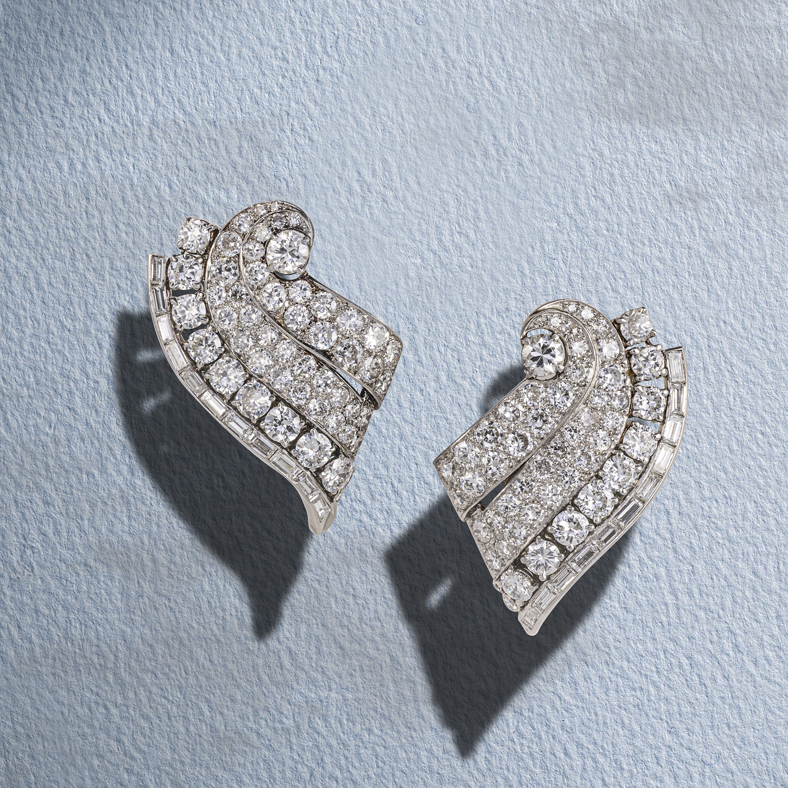 A PAIR OF ART DECO DIAMOND SCROLL EARRINGS, set with graduated old circular-cut diamonds and a border of baguette-shaped diamonds in platinum and white gold, total approximate diamond weight 15.00cts, clip fittings, length 3.9cm