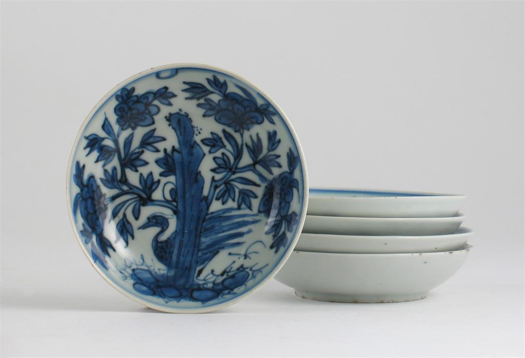 A set of five Chinese blue and white small dishes, each decorated with a bird in a floral landscape, rabbit mark, Wanli 1573-1620, 10cm. (5)