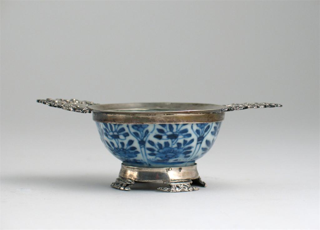 A Chinese blue and white wine cup, with silver metal mounts, Kangxi 1662-1722, the silver 19th century, 10.5cm.