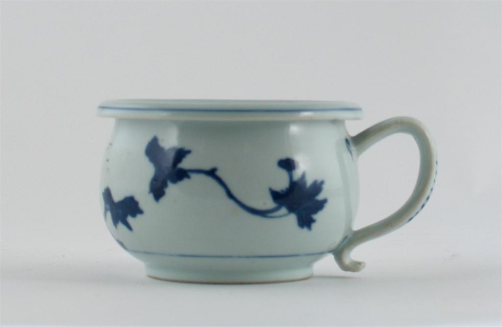 A Chinese chamber pot from the Nanking Cargo, painted in blue with a trailing vine, c.1750, 15.5cm. Christie's Nanking Cargo label.