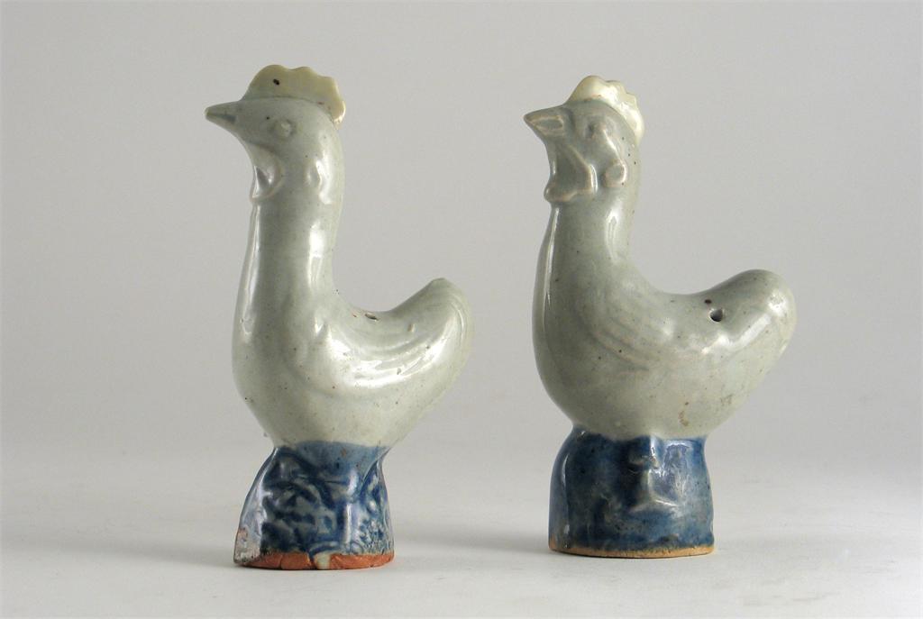 A pair of Chinese models of cockerels, their heads raised and standing on blue bases. Their combs restored. c.1800, 14cm. (2)