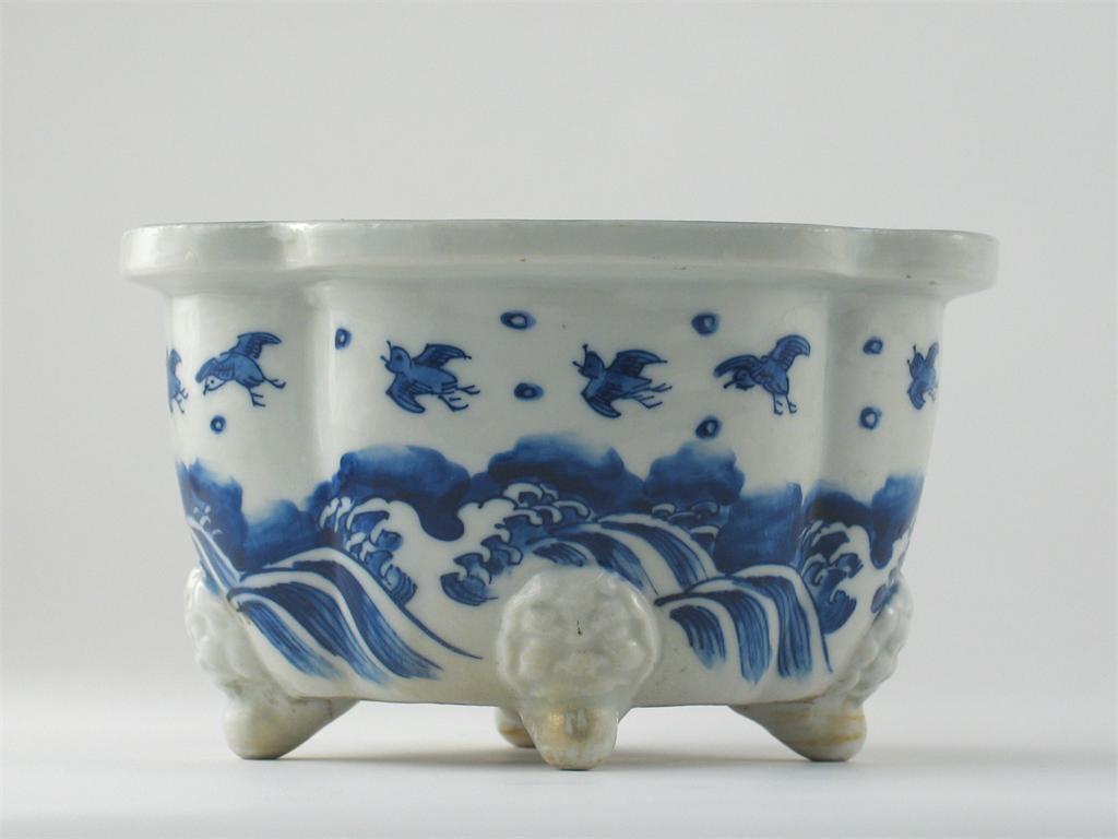 A Japanese blue and white quatre-lobed jardini?re, painted with sparrows in flight above breaking waves, c.1900, 19cm.