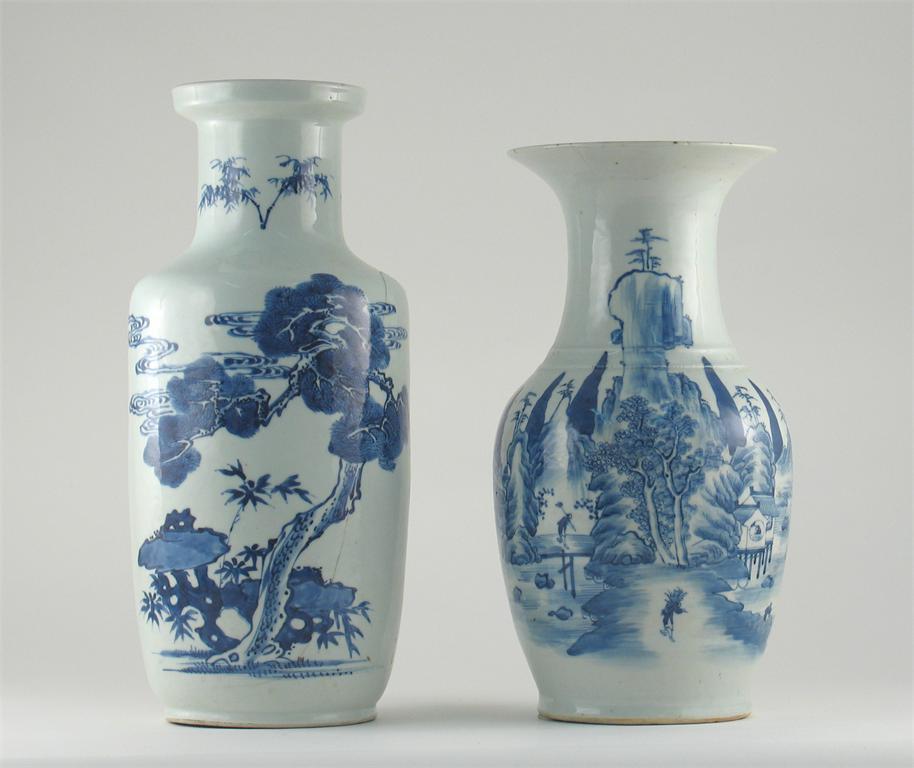 Two Chinese blue and white vases, one decorated with Shoulao, with four attendants and a child, the other with figures in a landscape. Both damaged. 19th century, 40cm. (2)