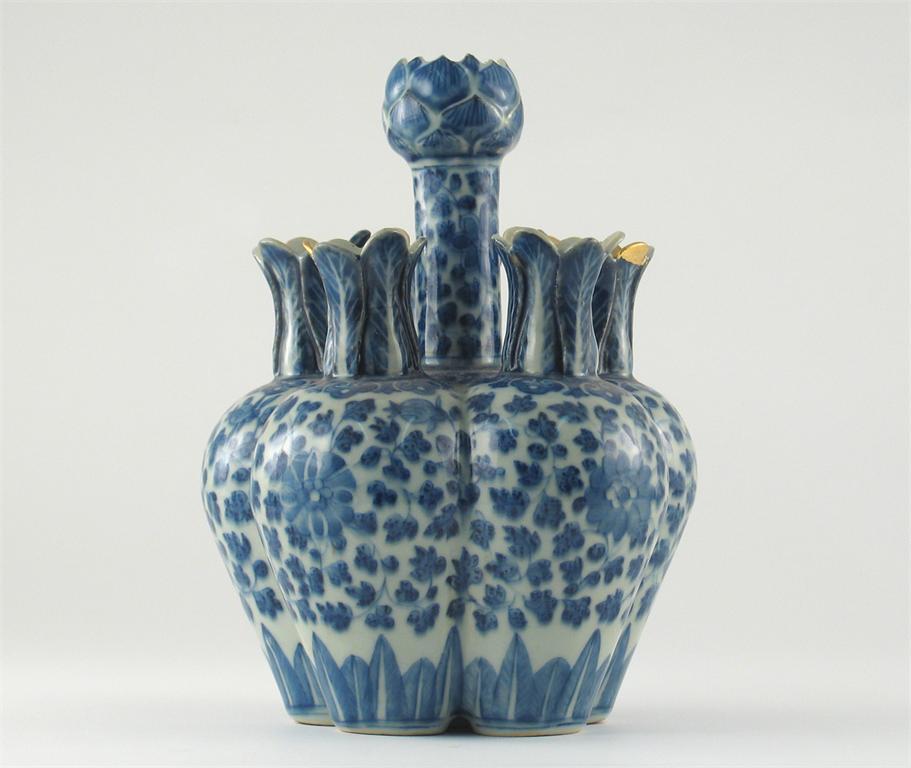 A Chinese blue and white tulip vase, decorated with scrolling chrysanthemum. Damage to the neck. 19th century, 24.5cm.