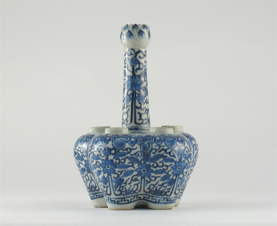 A Chinese blue and white vase, with a tall central neck with five apertures to the lobed body, 19th century, 24.5cm.