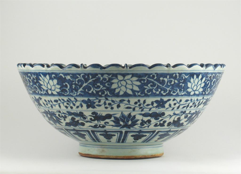 A large modern Chinese bowl painted in the Yuan style, with lotus, breaking waves and precious objects, 41cm.