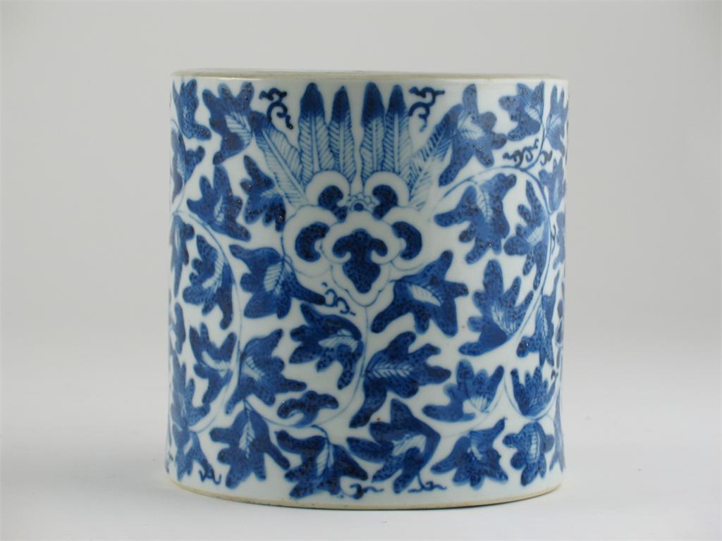 A Chinese blue and white cylindrical brushpot, decorated with scrolling leaves and lotus flowers, a four character Xuande mark, c.1900, 14cm.