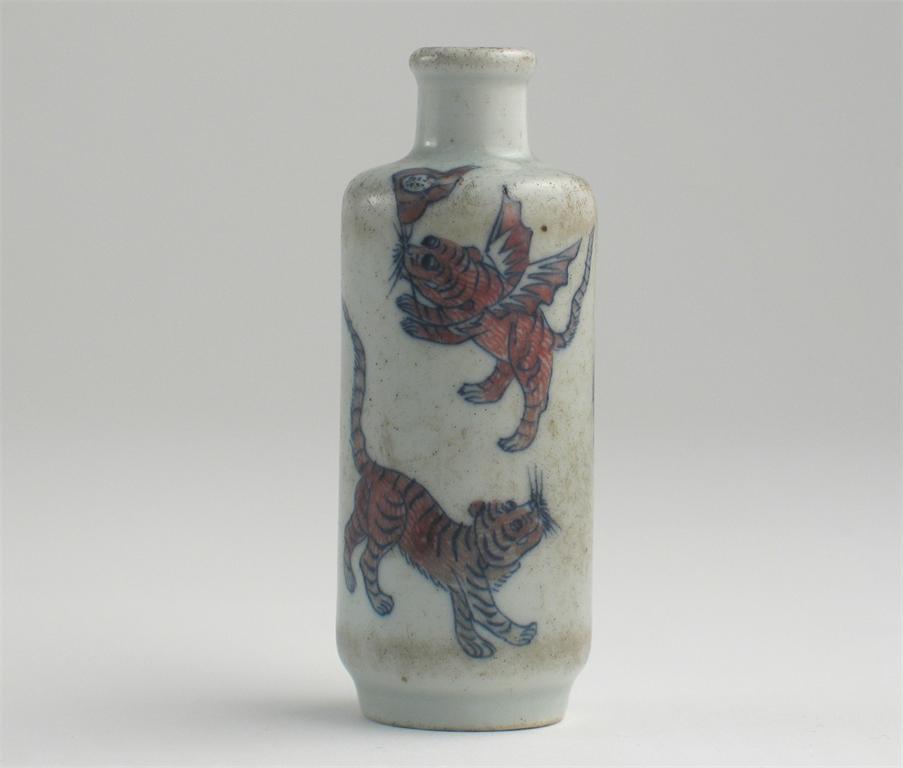 A Chinese cylindrical snuff bottle, decorated with five tigers, one winged and holding a flag in its jaws, the base with a sixth striped beast, 19th century, 8cm.
