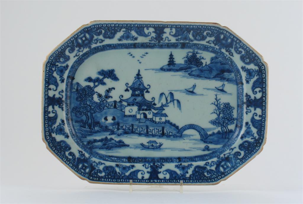 A Chinese blue and white rectangular dish, decorated with a pagoda landscape, Qianlong 1736-95. Slight damage. 29cm.