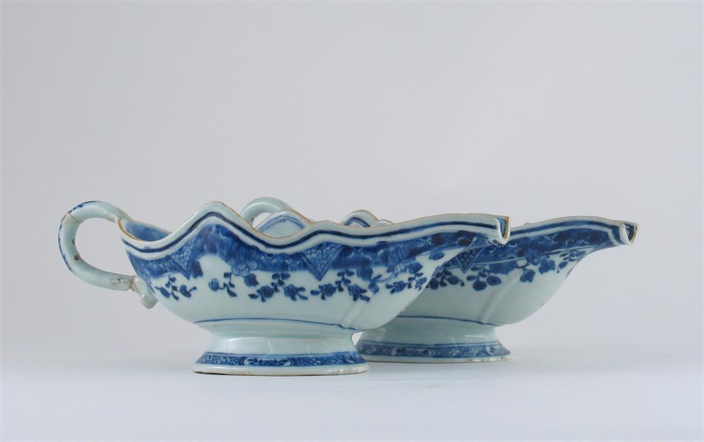 A pair of Chinese blue and white silver-shaped sauce boats, each painted with birds, rockwork, and flowers beneath pine trees. One handle damaged. 18th century, 25cm. (2).