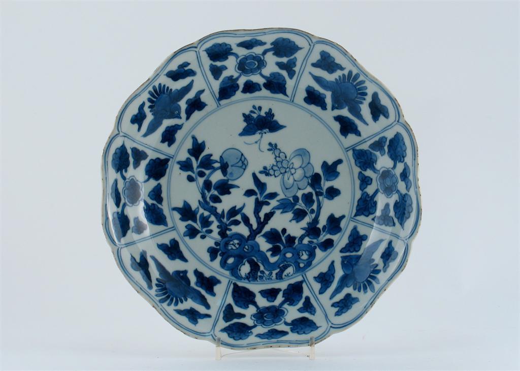 A Chinese blue and white moulded dish, painted with four birds, a butterfly and flowers, Kangxi 1662-1722, 23cm.