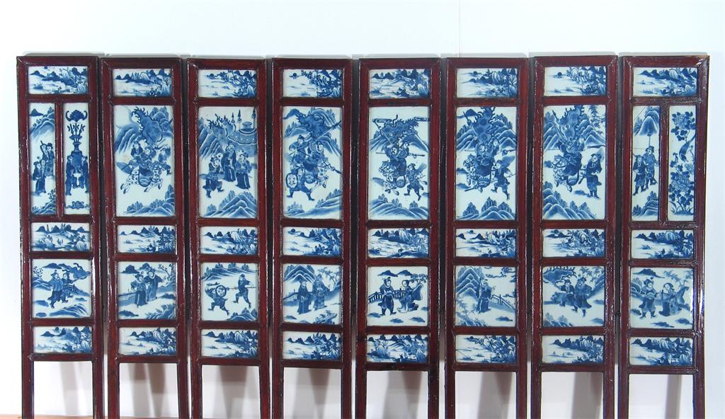 A Chinese eight panel screen, set with forty two blue and white porcelain panels, depicting figures in various pursuits in rocky landscapes. Some damages and repairs. 19th century, 145cm. long x 80cm. high. (8)