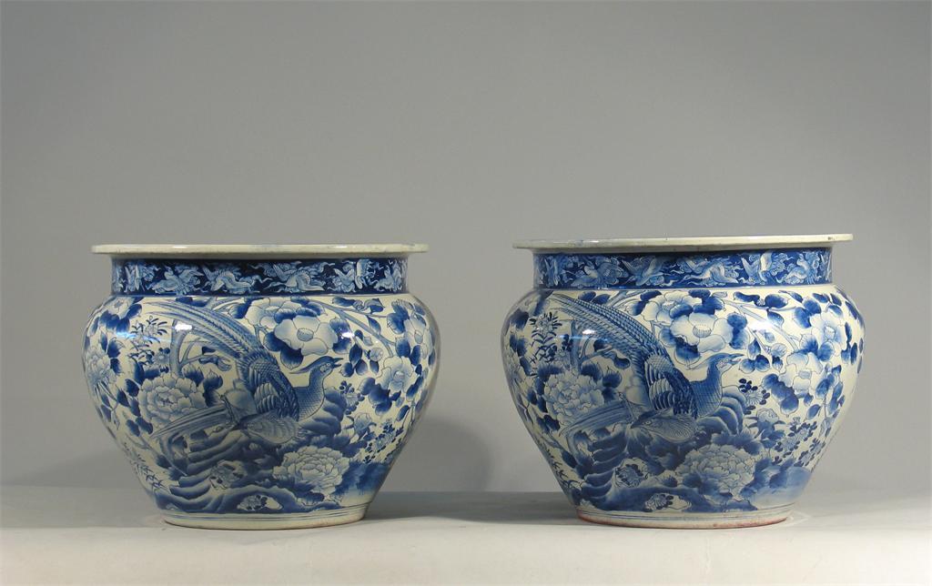 A massive pair of Japanese blue and white jardini?res, the bodies painted with pheasants amidst flowers and foliage, the necks with cranes and cloud scrolls, 19th century, 52cm. across. (2) Provenance: Woolton House, Newbury, Berkshire, Sotheby's house sale 6/7 December 1993, lot 240.