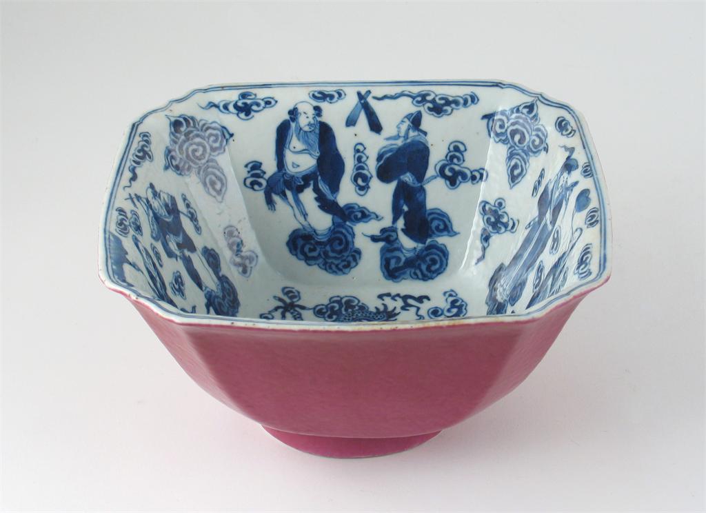 A Chinese square-section bowl, the interior painted in blue with the eight Daoist Immortals encircling a dragon, the exterior with a raspberry glaze, six character Xuande mark but 19th century, 26.5cm.