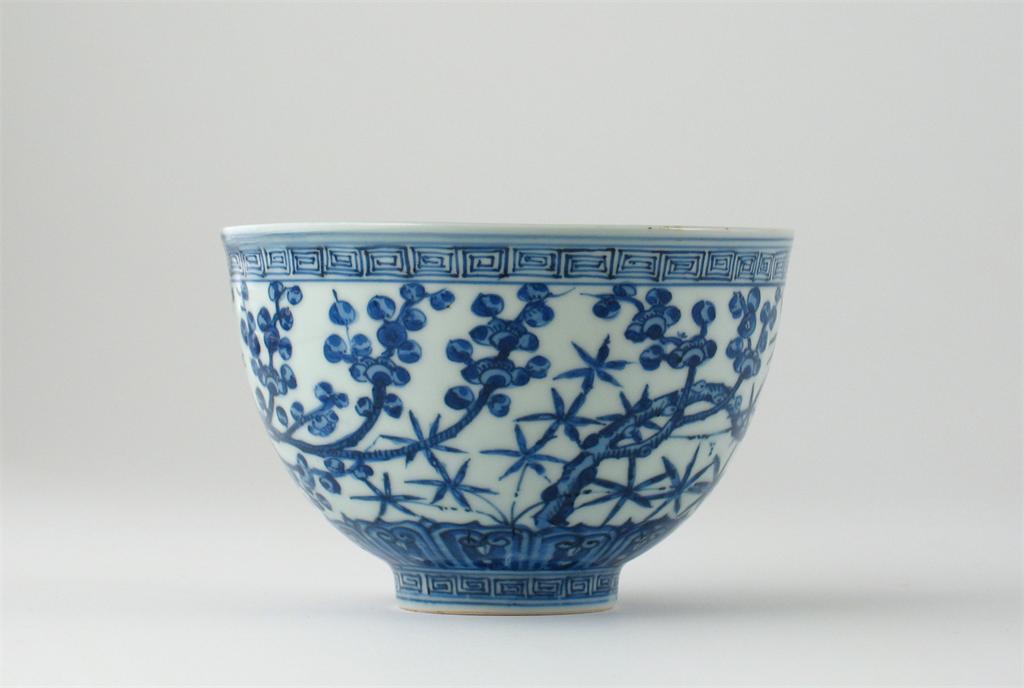 A rare Chinese blue and white bowl, decorated with bamboo and flowering prunus above a band of false gadroons, the rim with a key fret border, Xuande six character mark to the interior, Kangxi 1662-1722, 13cm.