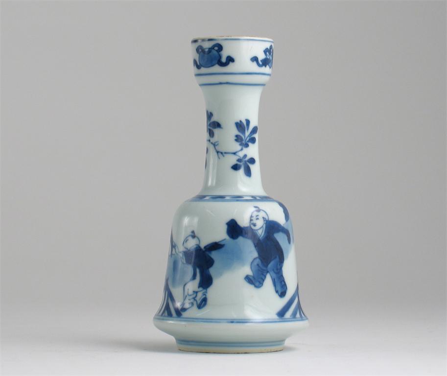 A Chinese blue and white bell-shaped candlestick, decorated with the wa wa playing on a fenced terrace, a flower spray round the narrow neck, beneath four auspicious symbols. Small frits. Six character Chenghua mark but Kangxi 1662-1722, 14cm.