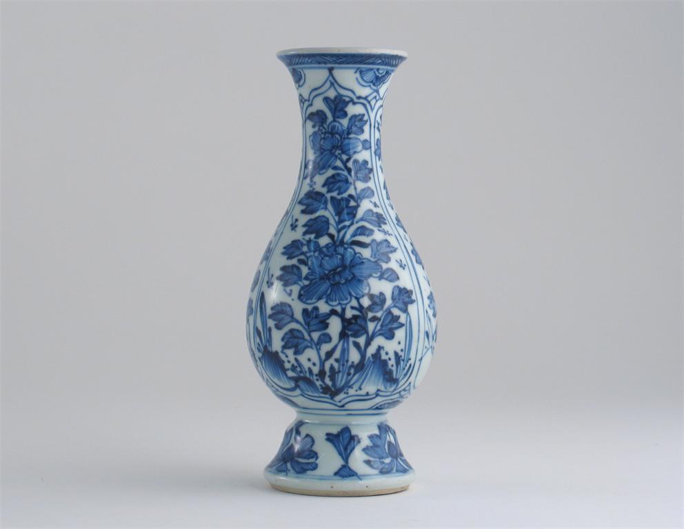 A small Chinese blue and white pear-shaped vase, decorated with three panels of peony and chrysanthemum, Kangxi 1662-1722, 15.5cm.