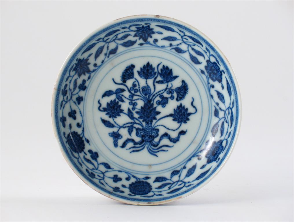 A Chinese Ming-style small saucer dish, decorated on the interior with a tied bouquet of lotus flowers and leaves, the rim and exterior with a continuous flower scroll. Small rim crack and chips. Qianlong six character mark and of the period 1736-95, 11.5cm.