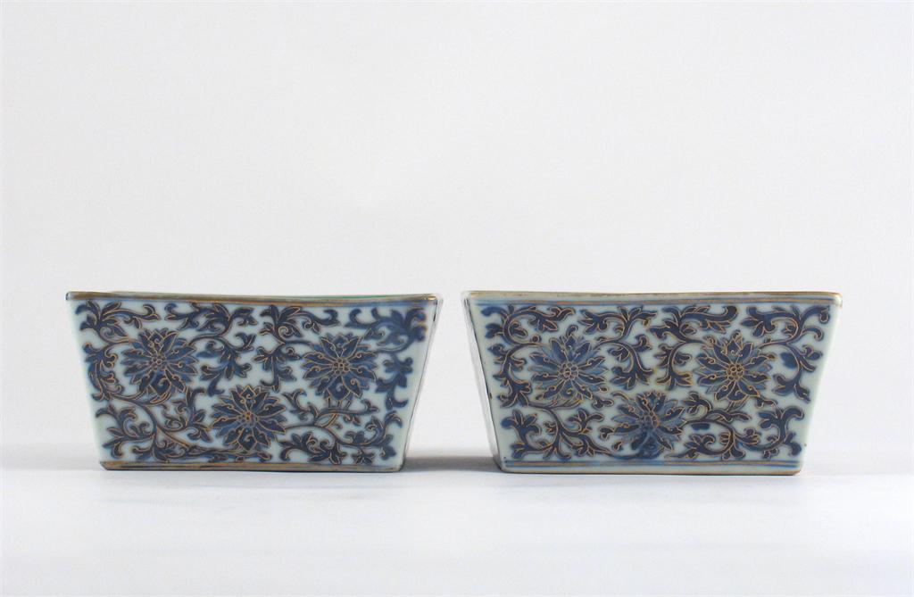 A pair of Chinese square-section flaring bowls, the exteriors decorated with a continuous lotus scroll in underglaze blue with gilt outlines, the interior and foot glazed in turquoise, each with a six character seal mark, 19th century, 12.5cm. (2)