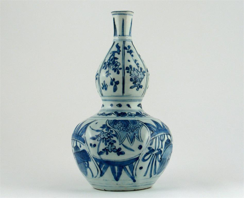 A good Chinese Kraak porcelain double gourd vase, decorated around the lower body with flower sprays and symbols in pomegranate-shaped panels, the upper bulb with panels of flowers and foliage, Wanli 1573-1620, 27cm. Cf: M. Rinaldi, Kraak Porcelain, p.173, plate 218 for a similar vase.