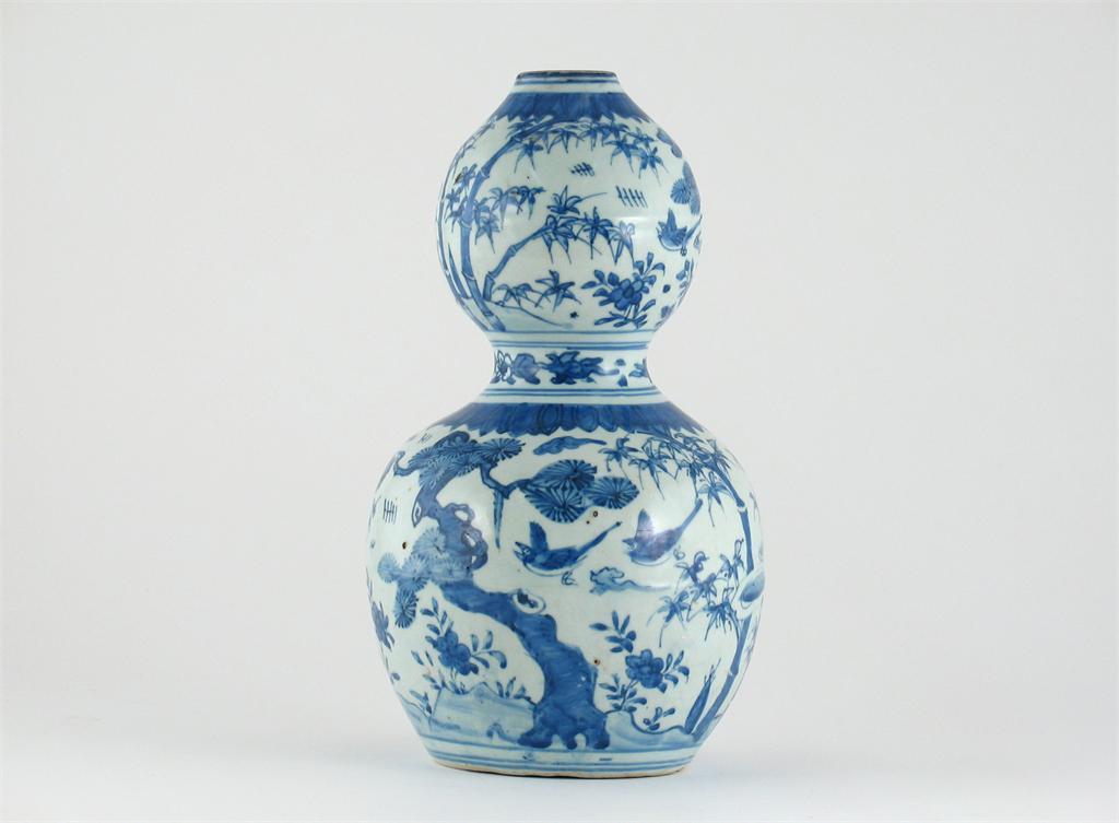 A Chinese blue and white double gourd vase, painted with sparrows in flight, amidst the three friends of winter, unmarked Wanli. The neck reduced. c.1600, 29cm.