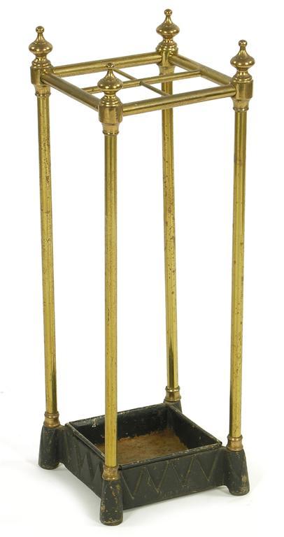 A turned brass and cast iron four division stick stand, with lift-out tray, early 20th century, 24.5in (62cm) h, 8.5in (21.5cm) square.