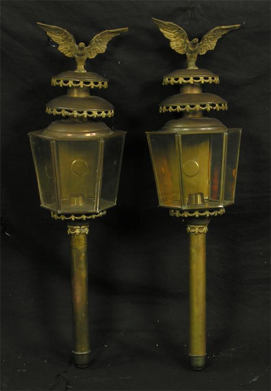 A pair of gilt brass carriage lamps, having eagle surmounts, converted to electricity, 28.5in (72.5cm) h. (2)