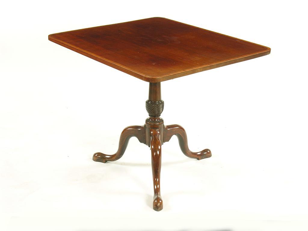 A George III mahogany tripod table, the later rectangular tilt top satinwood banded revolving on a birdcage to a turned and spiral fluted bowl, 28.75in (73cm) h, 33.5in (85cm) w, 29.5in (75cm) d.