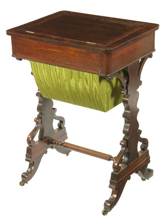 A mid 19th century rosewood work table, the top with a hinge panel to a open recess above a pull-out bag on trestle end supports united by a turned stretcher, 29.5in (75cm) h, 20.5in (52cm) w, 16.5in (42cm) d.