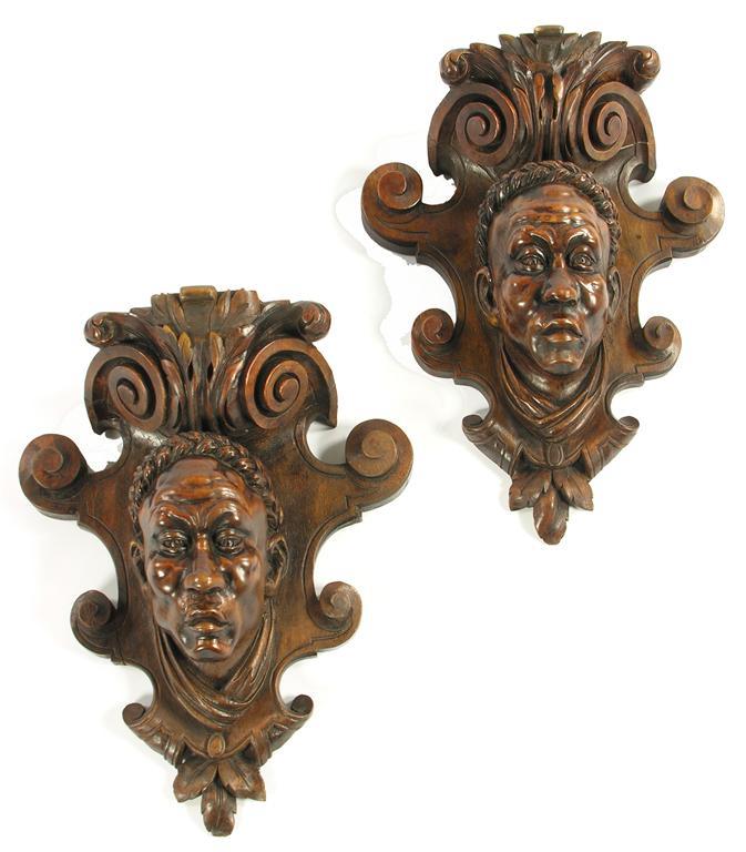 A pair of carved and stained wood Black Forest type brackets, the cartouche back with leaf and scroll surmount above a male mask, 17.75in (45cm) h, 14in (35.5cm) w. (2)