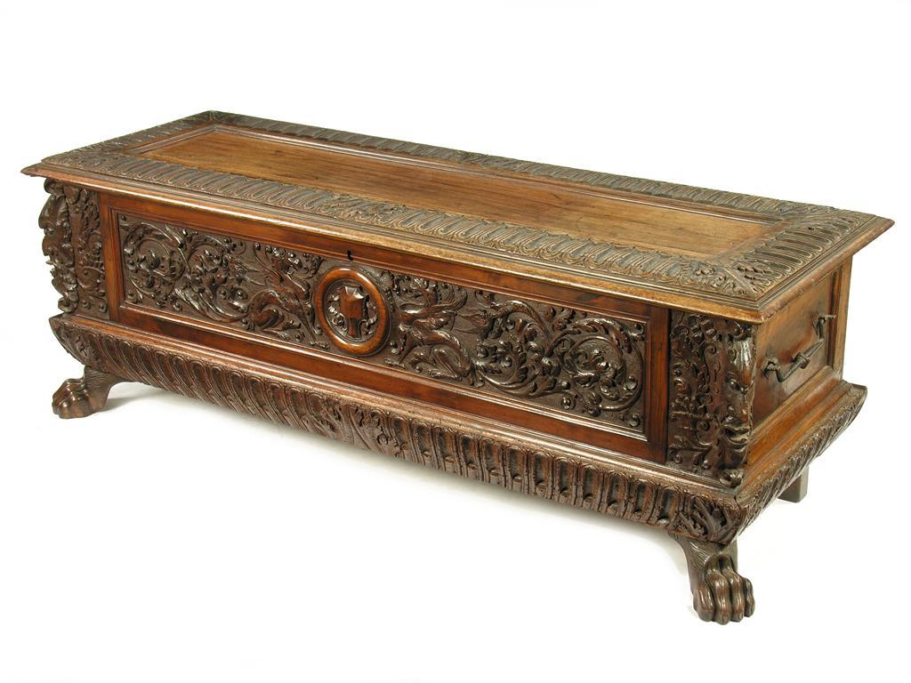 A late 17th century Italian walnut cassone, with carved decoration and hinged cover, the front with a central cartouche flanked by arabesques on a shaped apron to later paw feet, 24.75in (63cm) h, 71.5in (181.5cm) w, 25.5in (65cm) d.