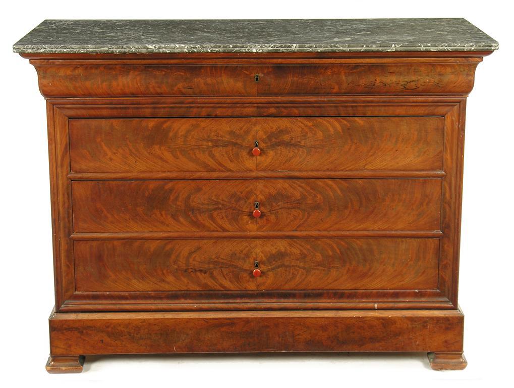 A 19th century French mahogany commode, the reeded edge grey marble top stencilled to the underside 'B 1790', above a frieze drawer and three further drawers within a moulded border fitted later handles the base with a drawer on block feet, 36.75in (93.5cm) h, 50in (127cm) w, 22.25in (56.5cm) d.