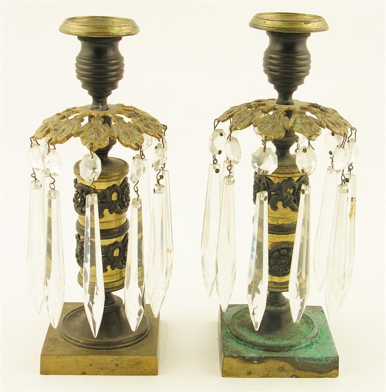 A pair of 19th century brass and bronze candlesticks, with cut glass lustres, 9.5in (24cm) h. (2)