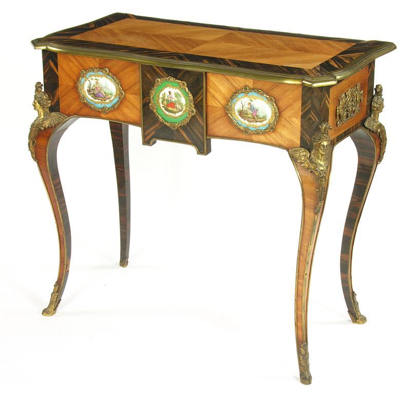 A 19th century calamander, kingwood and ormolu mounted side table, the shaped top above a conforming frieze with three applied porcelain panels painted figures in landscapes, the cabriole legs with winged female mask mounts to hoof feet, 31.5in (80cm) h, 34in (86.5cm) w, 17.5in (44.5cm) d.
