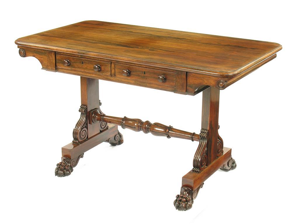 A George IV rosewood library table, by Johnstone Jupe & Co, the moulded edge top above a pair of frieze drawers, one stamped 'Johnstone Jupe & Co, New Bond St. London 3401', fitted replaced knob handles and false reverse drawers, the end supports with reeded scroll volutes united by a petal turned stretcher, the platform bases with carved paw feet and sunken brass castors, 29in (73.5cm) h, 49in (124.5cm) w, 28in (71cm) d.