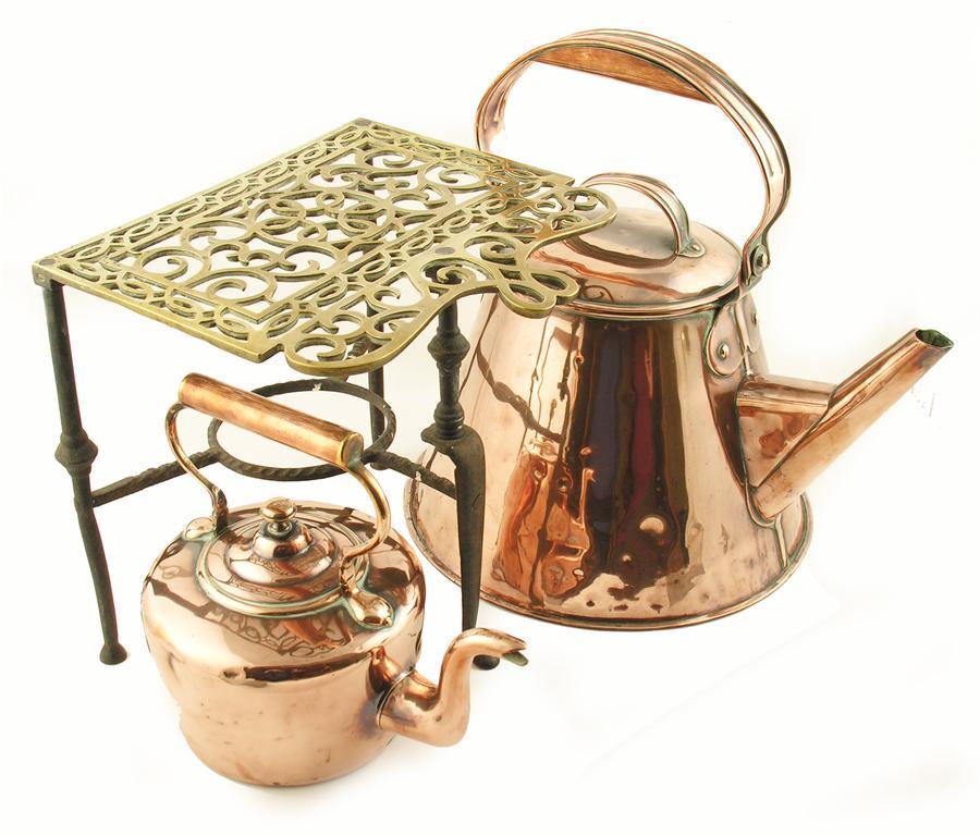 A 19th century pierced brass and iron trivet, 11.5in (29.4cm) h, 12.5in (32.1cm) w, 11.25in (28.4cm), a large copper kettle 10.5in (26.5cm) h, and a smaller copper kettle. (3)