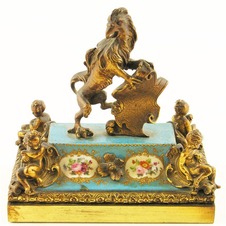 A late 19th century French porcelain and gilt metal mounted paperweight, 5.5in (14cm) h, 5.5in (14cm) w, 3.5in (8.8cm) d.