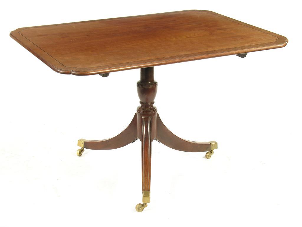 A mahogany breakfast table, the rectangular cusp cornered tilt top with banding and ebonised stringing on a vase turned stem to three moulded scroll legs with brass castors, 19th century and later, 28in (71cm) h, 33 x 45in (84 x 114cm).