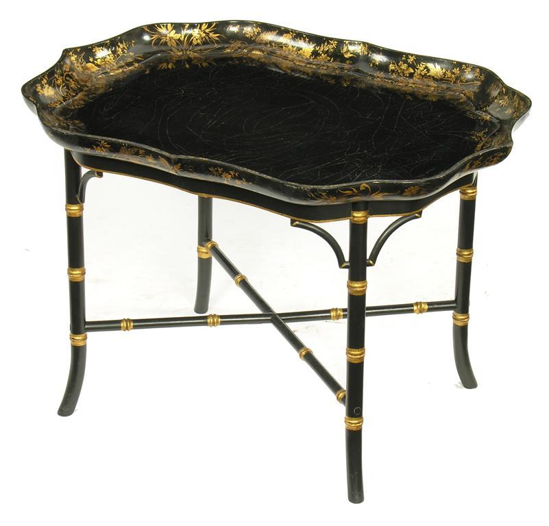 A late Regency shaped rectangular papier mache tray by Clay, the border decorated gilt foliage sprays, the underside stamped 'Clay, King St Covt. Garden' on a later fixed 'bamboo' stand, 20in (50.5cm) h, 29.25 x 22in (74 x 56cm).