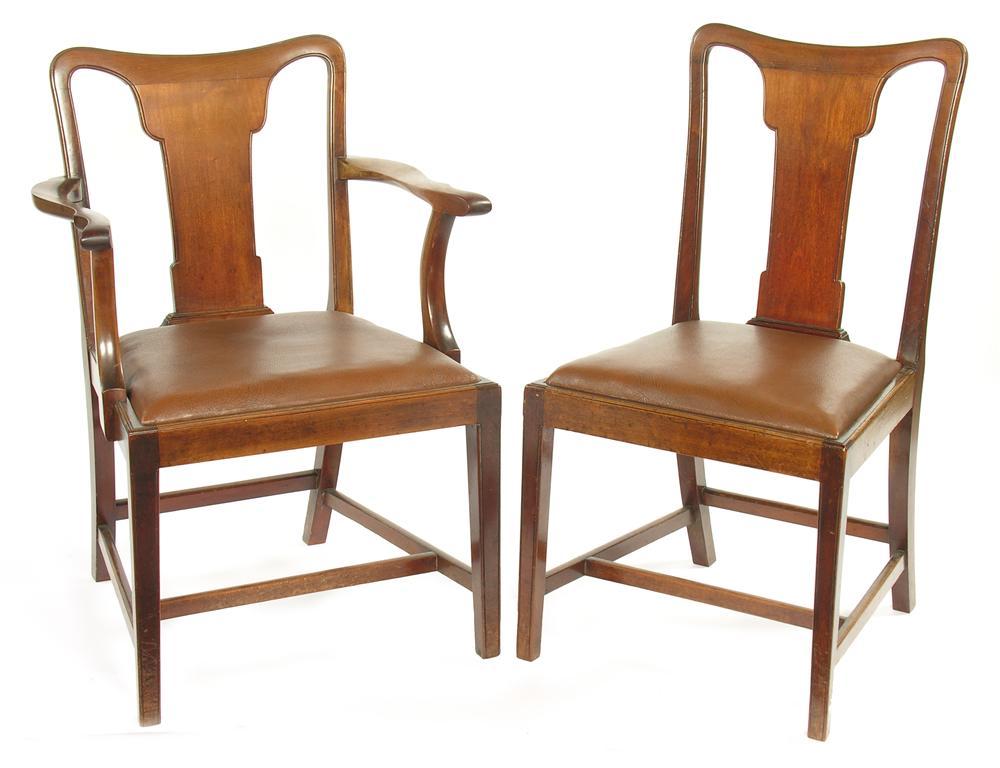 A set of six late Victorian mahogany dining chairs, with leatherette drop in seats comprising a pair of open armchairs and four side. (6)